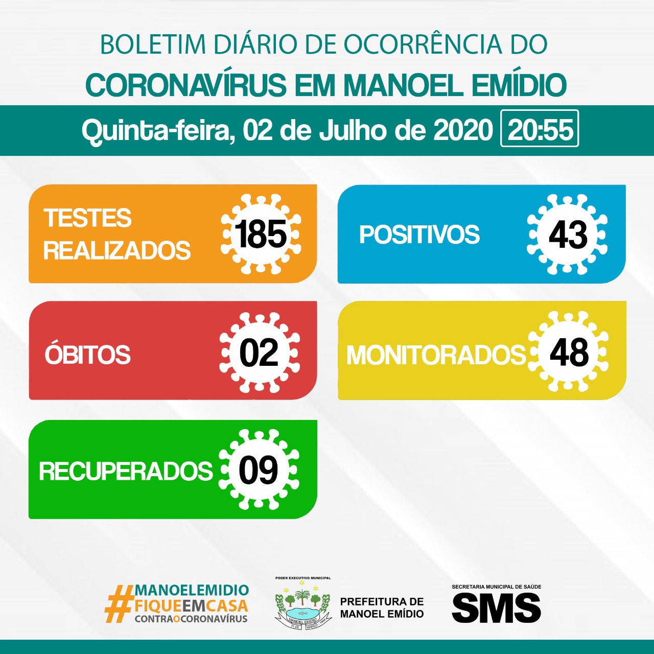 Segue o boletim diário da ocorrência da COVID-19 em Manoel Emídio. (02/07/2020)