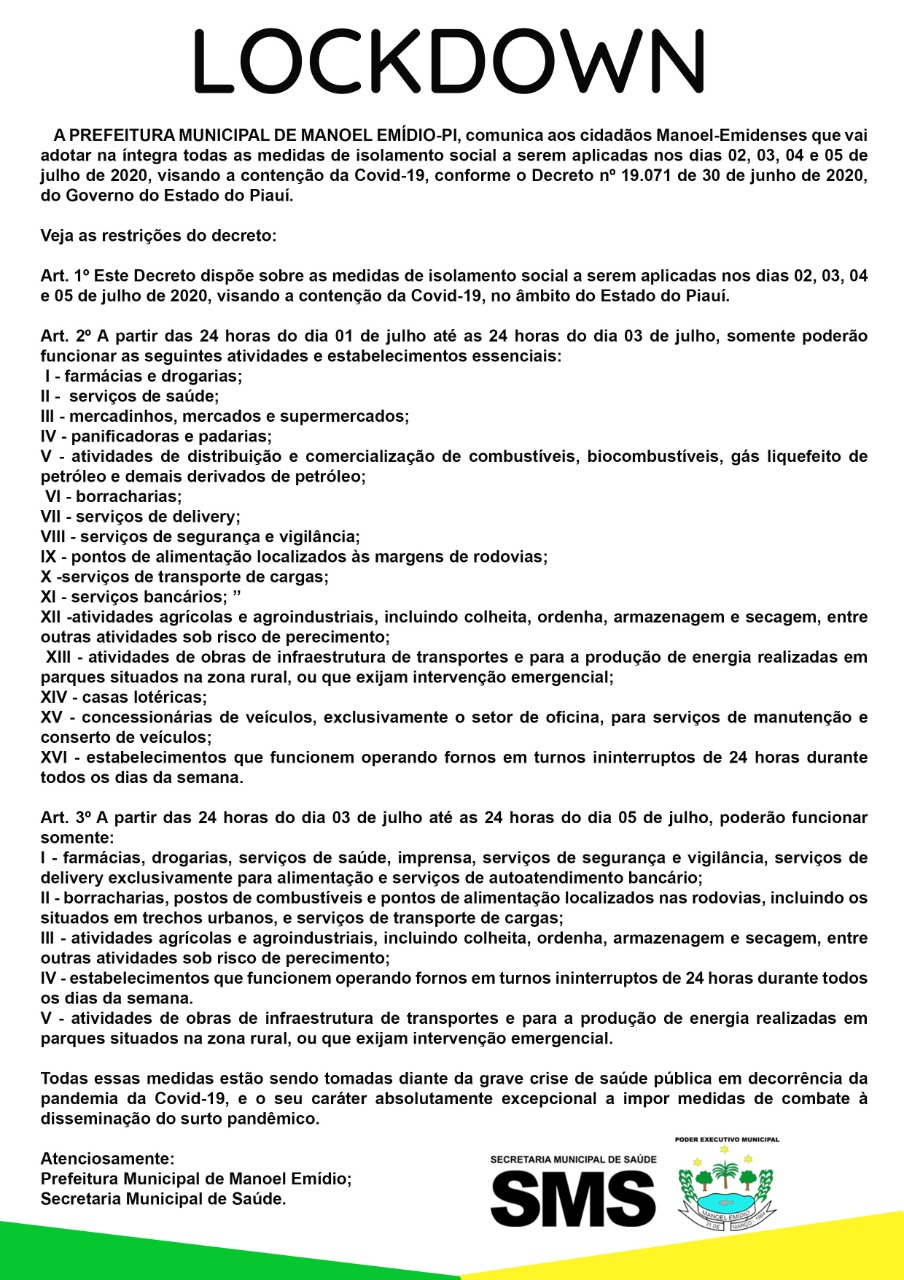 Em mais uma medida que visa conter a propagação do novo coronavírus, a Prefeitura Municipal de Manoel Emídio decretou 'lockdown' de quatro dias, com restrições quanto ao funcionamento do comércio. As medidas são válidas entre quinta-feira (02) e domingo (05).